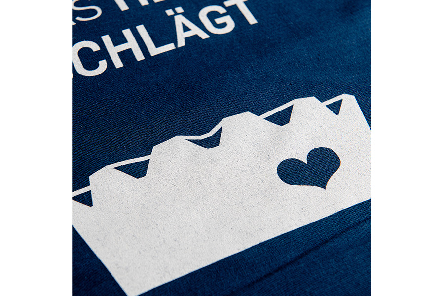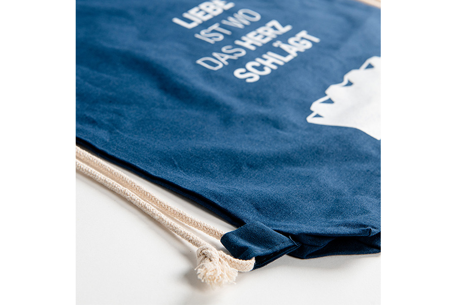This blue gymsac is equipped with natural colored cords. The white print on the front stands for a commitment to Ruhr University Bochum, which comes from the heart. The solid material quality of the Gymsac is made of 100% GOTS and FairWear certified edo-cotton.