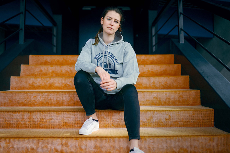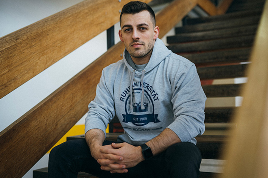 Classic hoodie with for him and her in an unisex cut, made of 100%  GOTS and FairWear certified eco-cotton. The blue print on the front shows the "Audimax", the landmark of Ruhr University Bochum.
