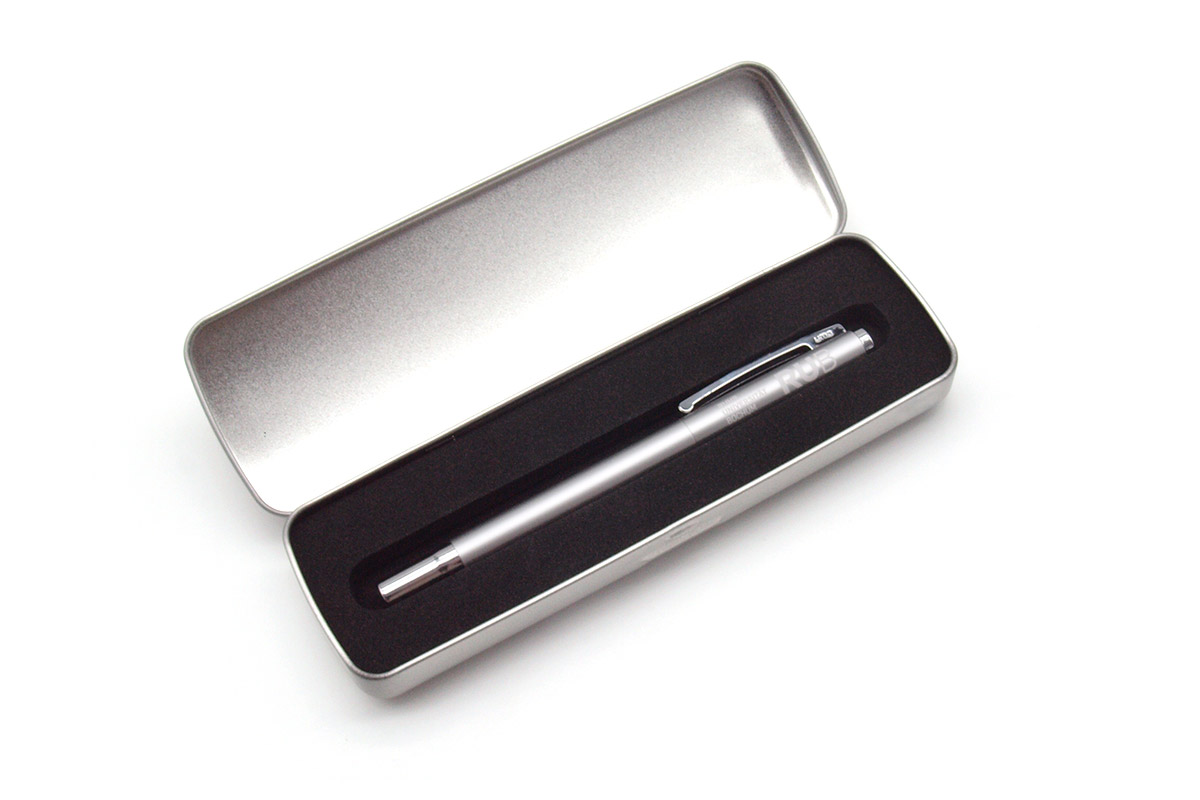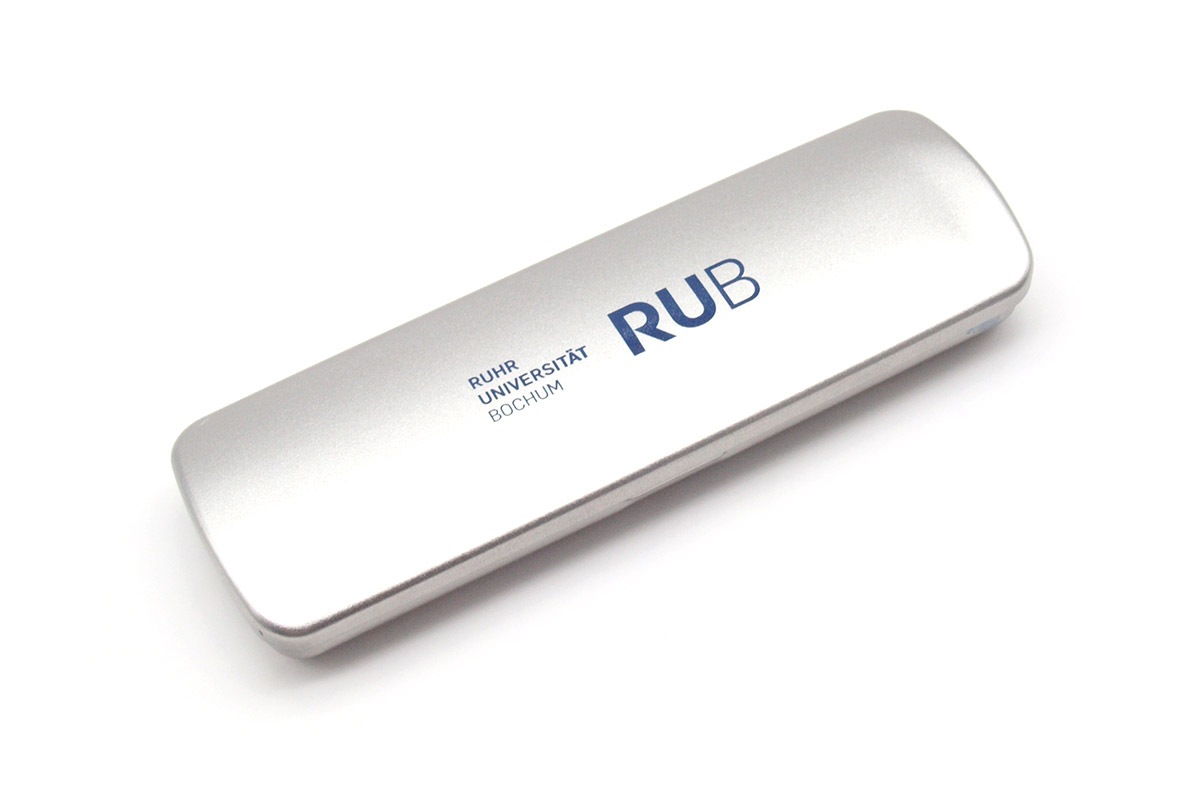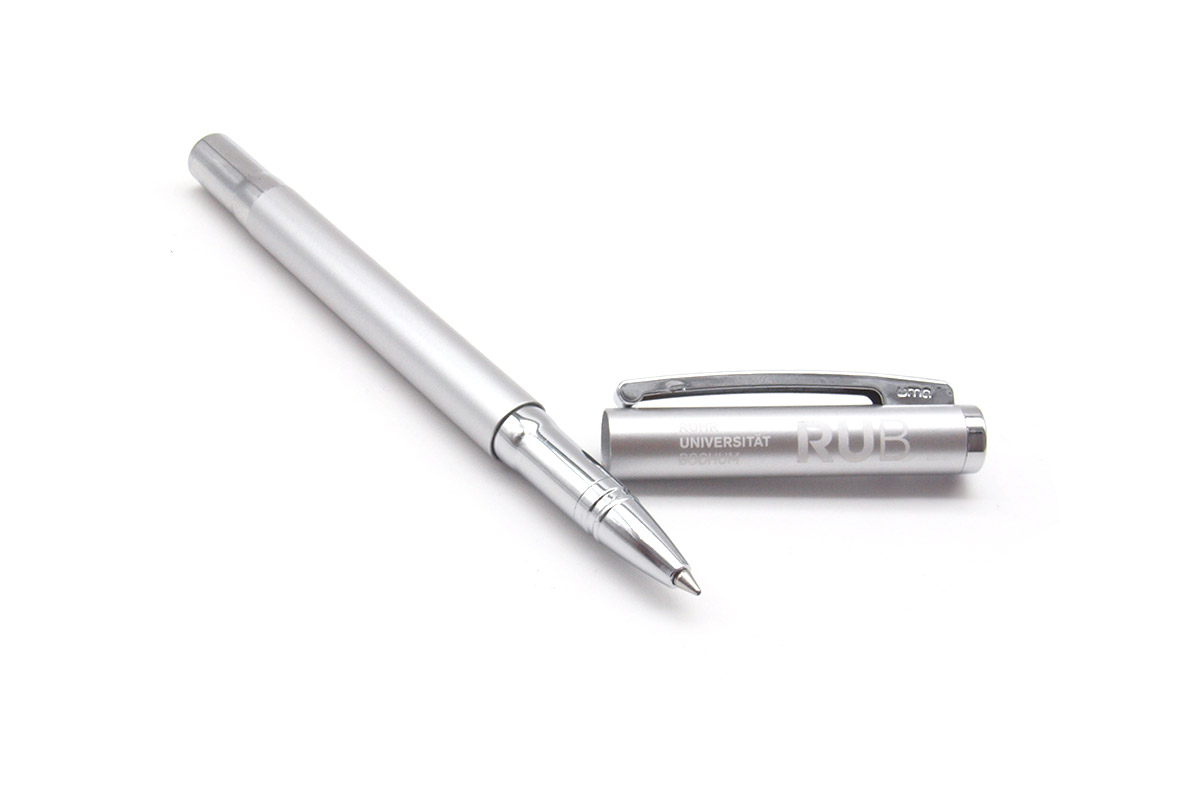 The silver rollerball pen has blue writing color and comes packaged in a classic metal case with blue Ruhr University Bochum logo.